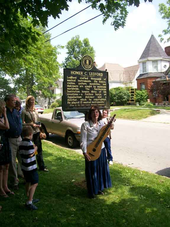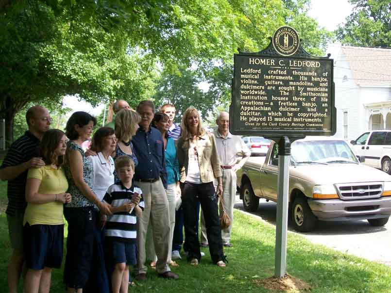 Colista Ledford poses with Homer's #6000 dulcimer while the Ledford family looks on.