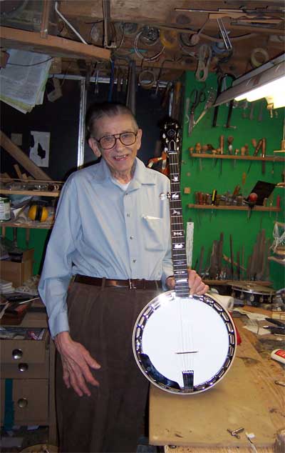 Homer with banjo #537. This is one of 13 bluegrass banjos that Homer built and the last banjo he produced. This instrument is owned by Bill Johnson of Lexington, KY