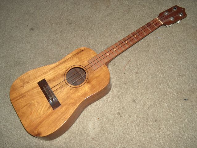 Dayton, Ohio. It is of walnut, has staple frets only under the first two